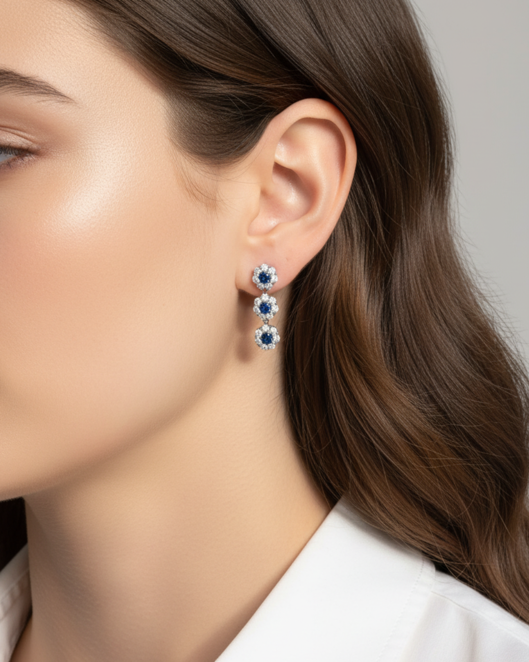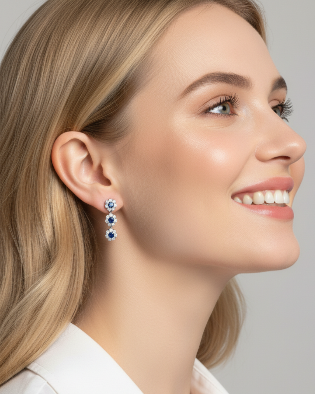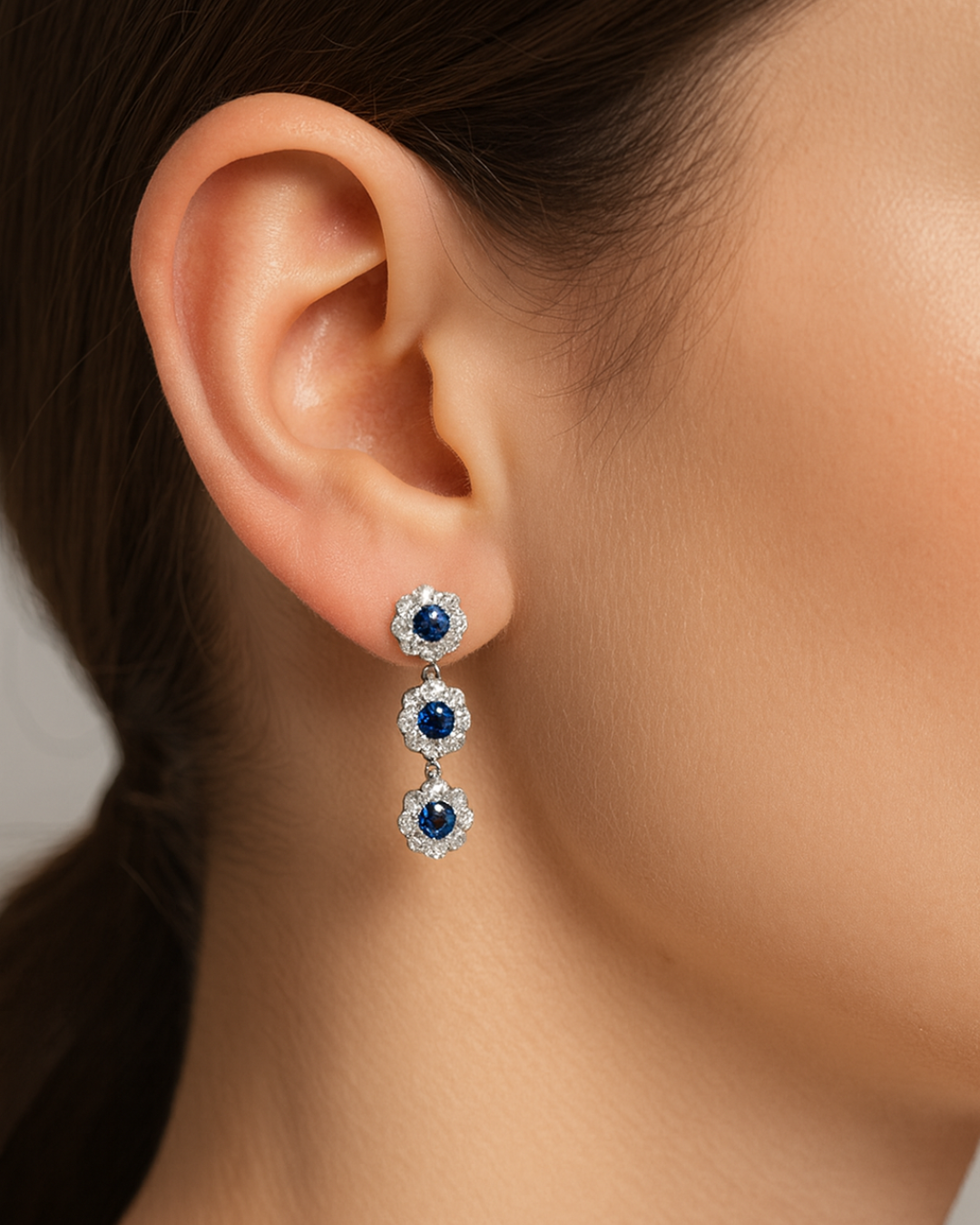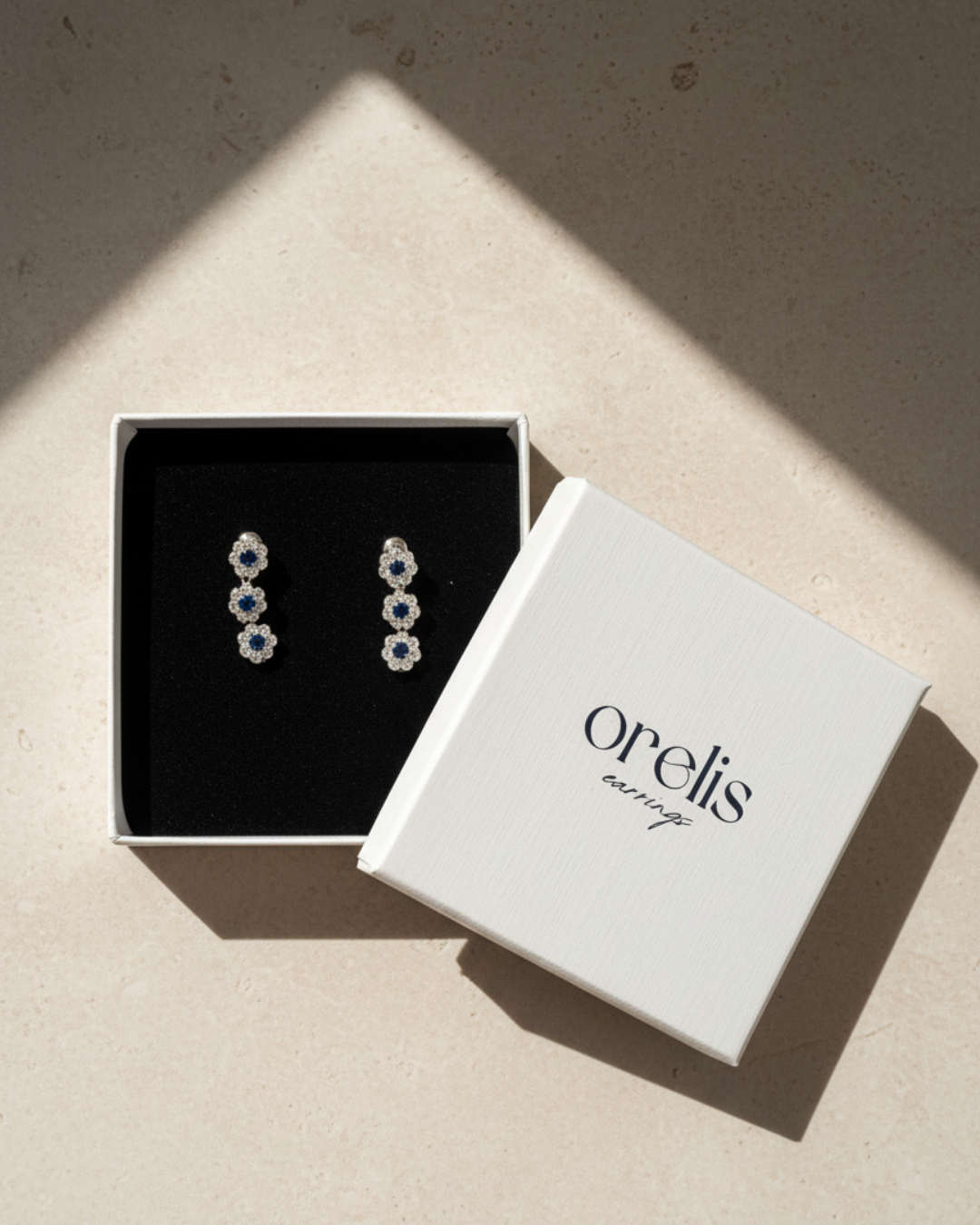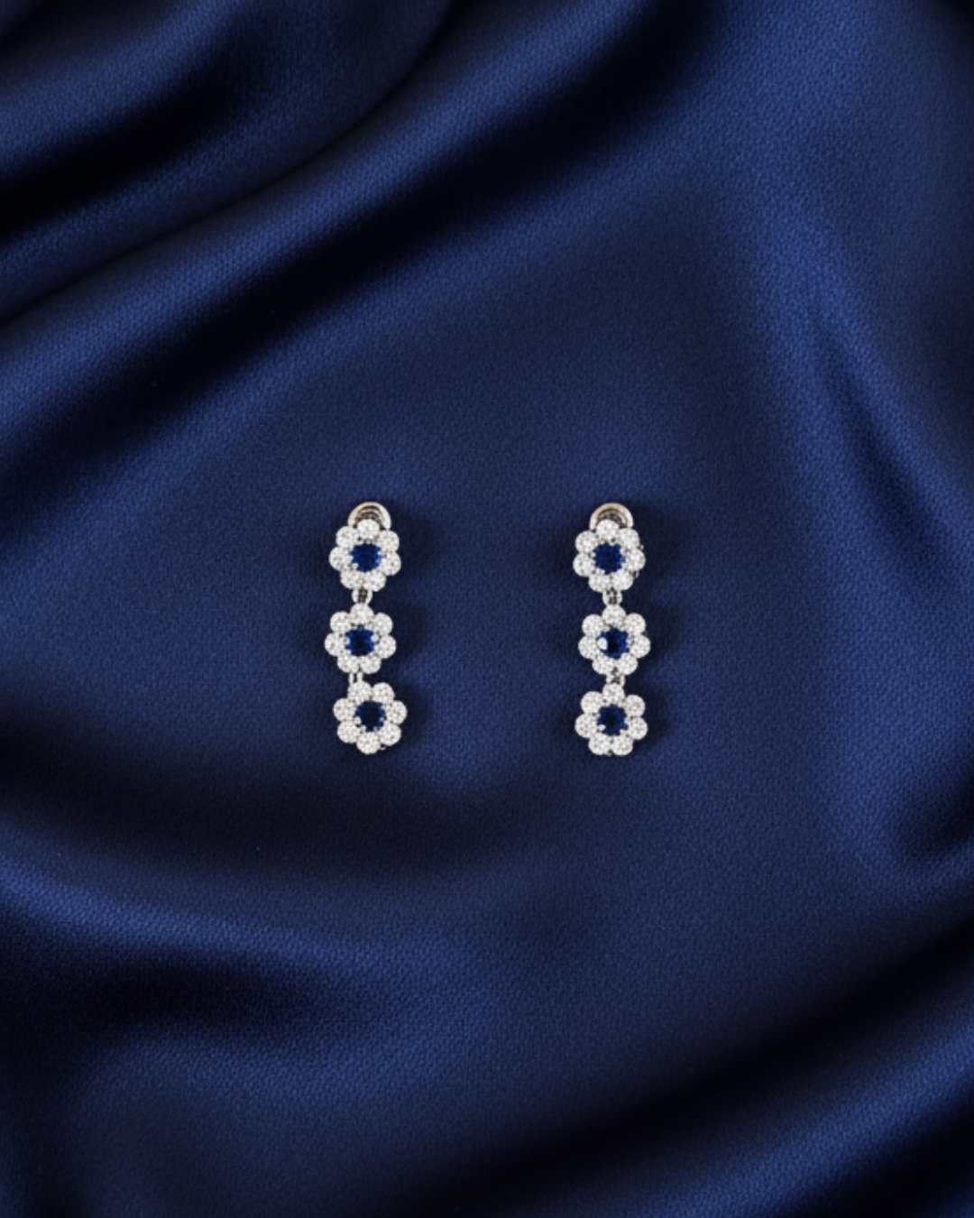 Grace your ears with timeless elegance. Featuring three cascading floral motifs encrusted with sparkling cubic zirconia and deep sapphire-blue centers, Celeste earrings bring out your most radiant side. Lightweight yet eye-catching, they’re the perfect finishing touch for evenings out or refined everyday style.